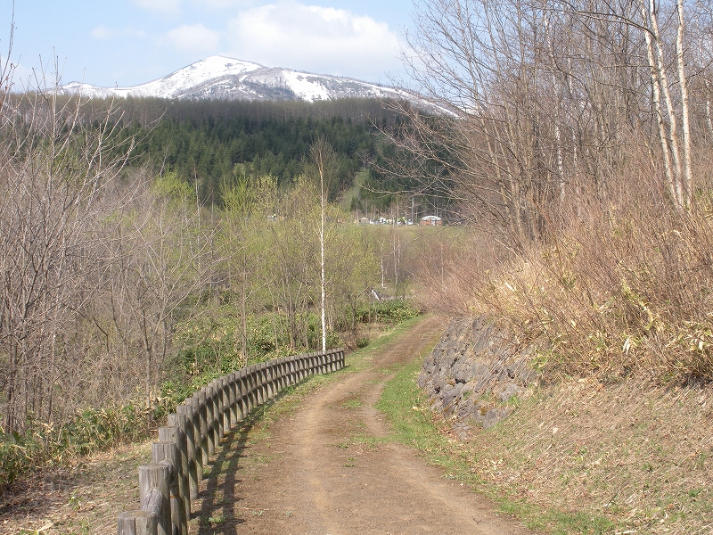 散策路の途中からサイト側を見ていますが、さすがに5月のため山頂にはまだ雪が残っています。