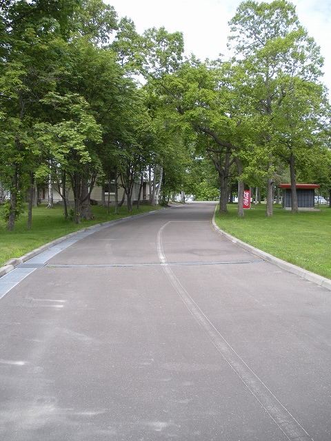 キャンプ場に入るとこのようにサイト中央に舗装道路が通っています。通路の両側にテントサイトが広がっています。