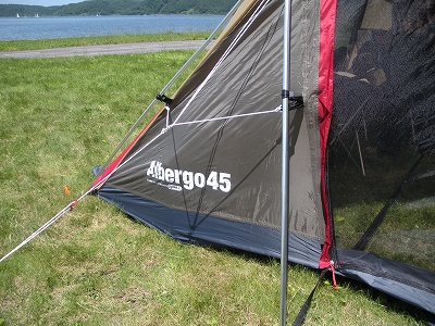 アルバーゴのとても美しいフォルムに感動を覚えながら、ホッと一息つきました。インナーとフライシートが一体なので、ポールを通してしまえば、一度に全部持ち上げることができます。なので、慣れてしまえば短時間で簡単に設営できてしまうのですが、この時は初めての設営だったのでおそらく30分くらいはかかっていたかもしれません。