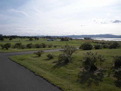 サイトの様子ですが、とても開放的です。網走湖そのものは水が濁っており、けっしてきれいとはいえないのですが、周囲の環境は申し分ありません。サイトの後ろに国道が走っていたり、線路があったりなど、日中は少し車や鉄道の音が気になるかもしれませんが、夜は車の通りも少ないでしょうから、静かに過ごすことができるのではないかと予想します。