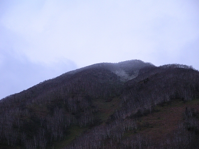 昨晩の雨が頂上付近では雪に変わったのか、後方の白雲山の頂上付近に白い雪化粧が薄っすらと見えました。